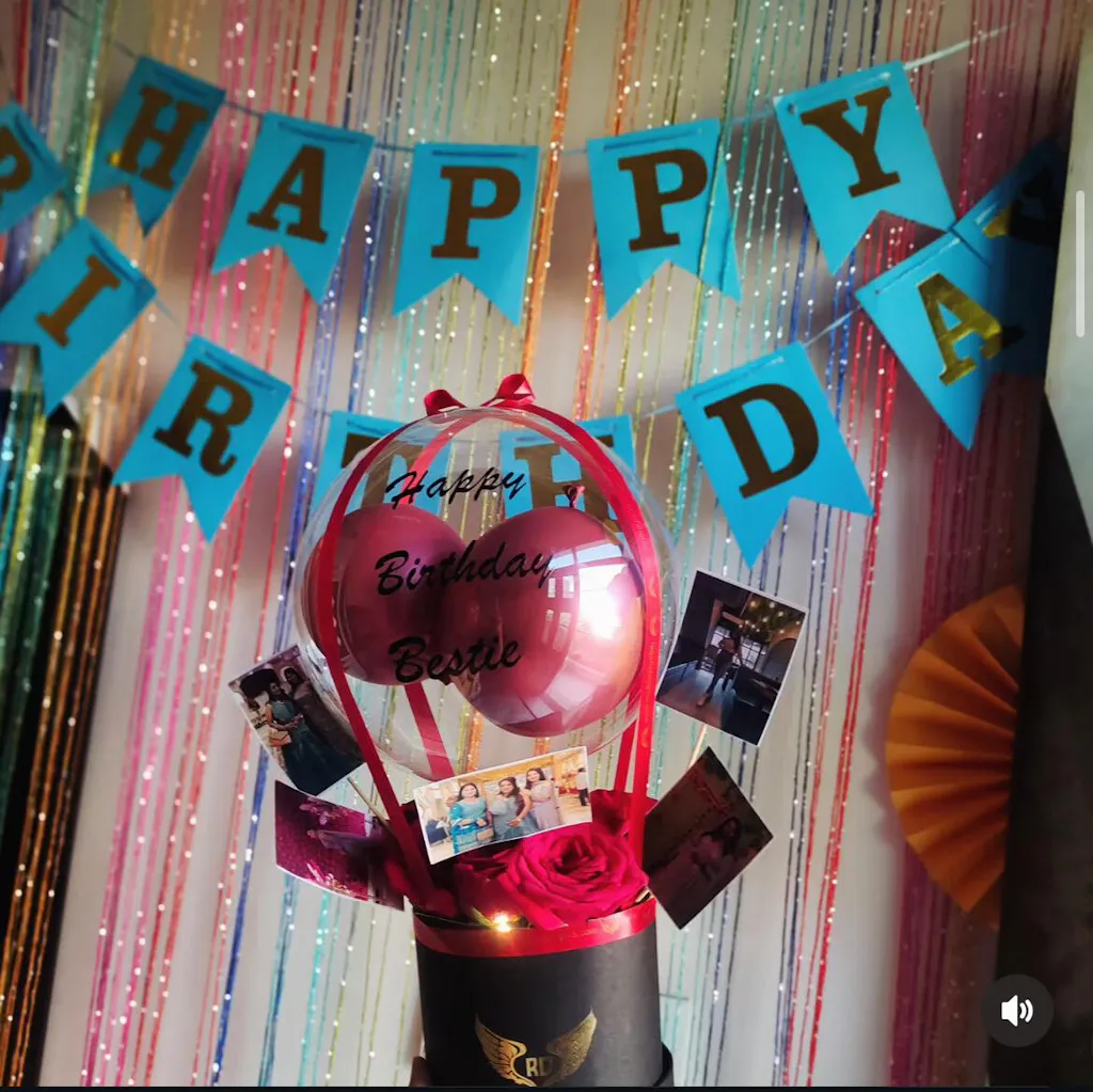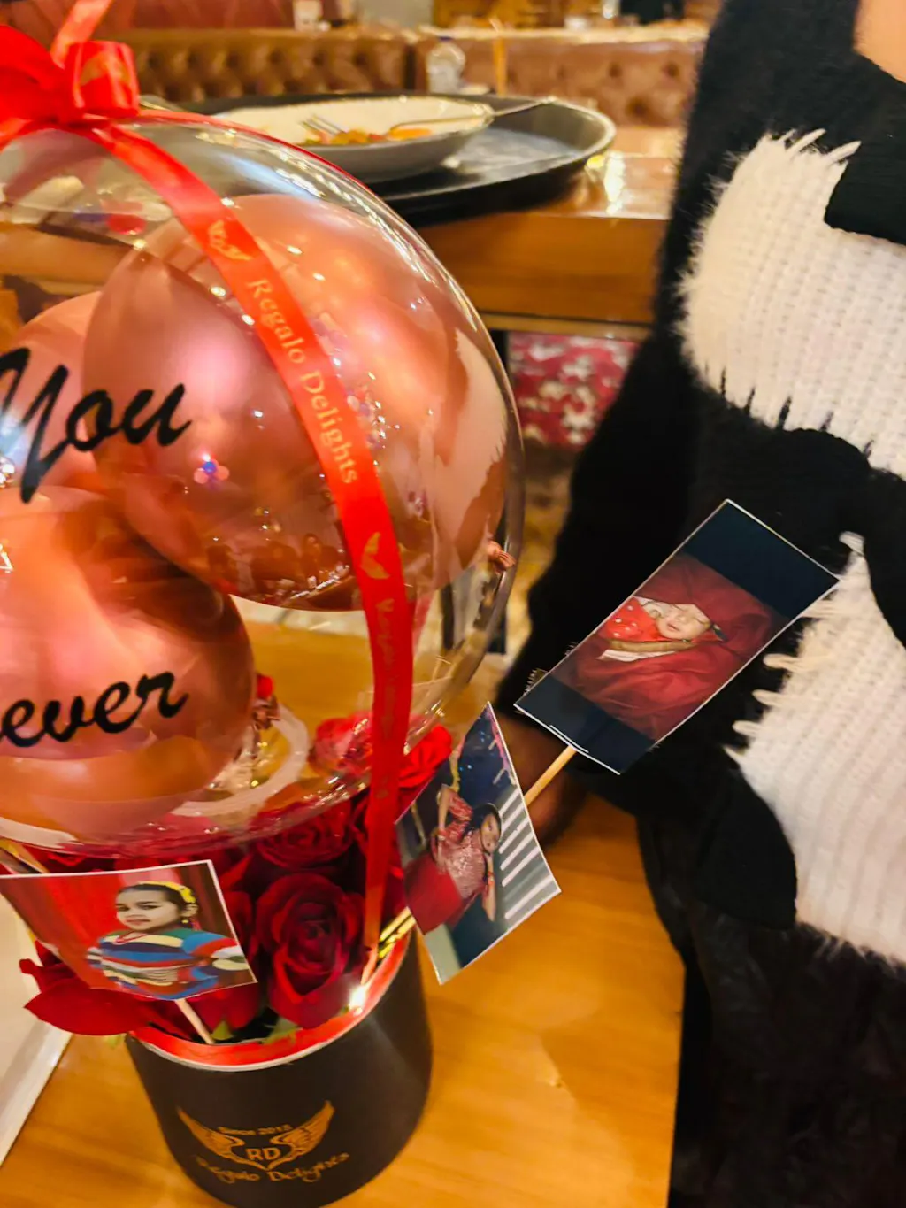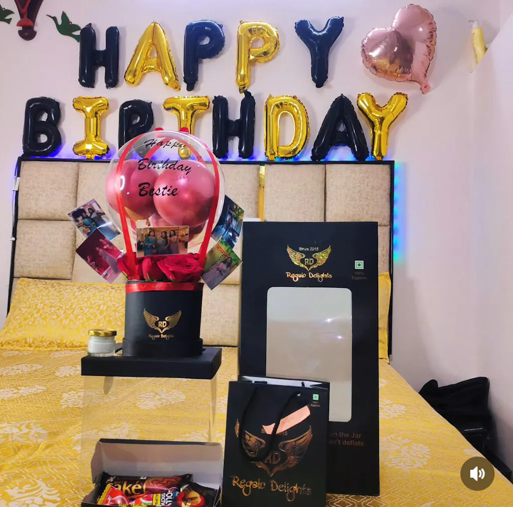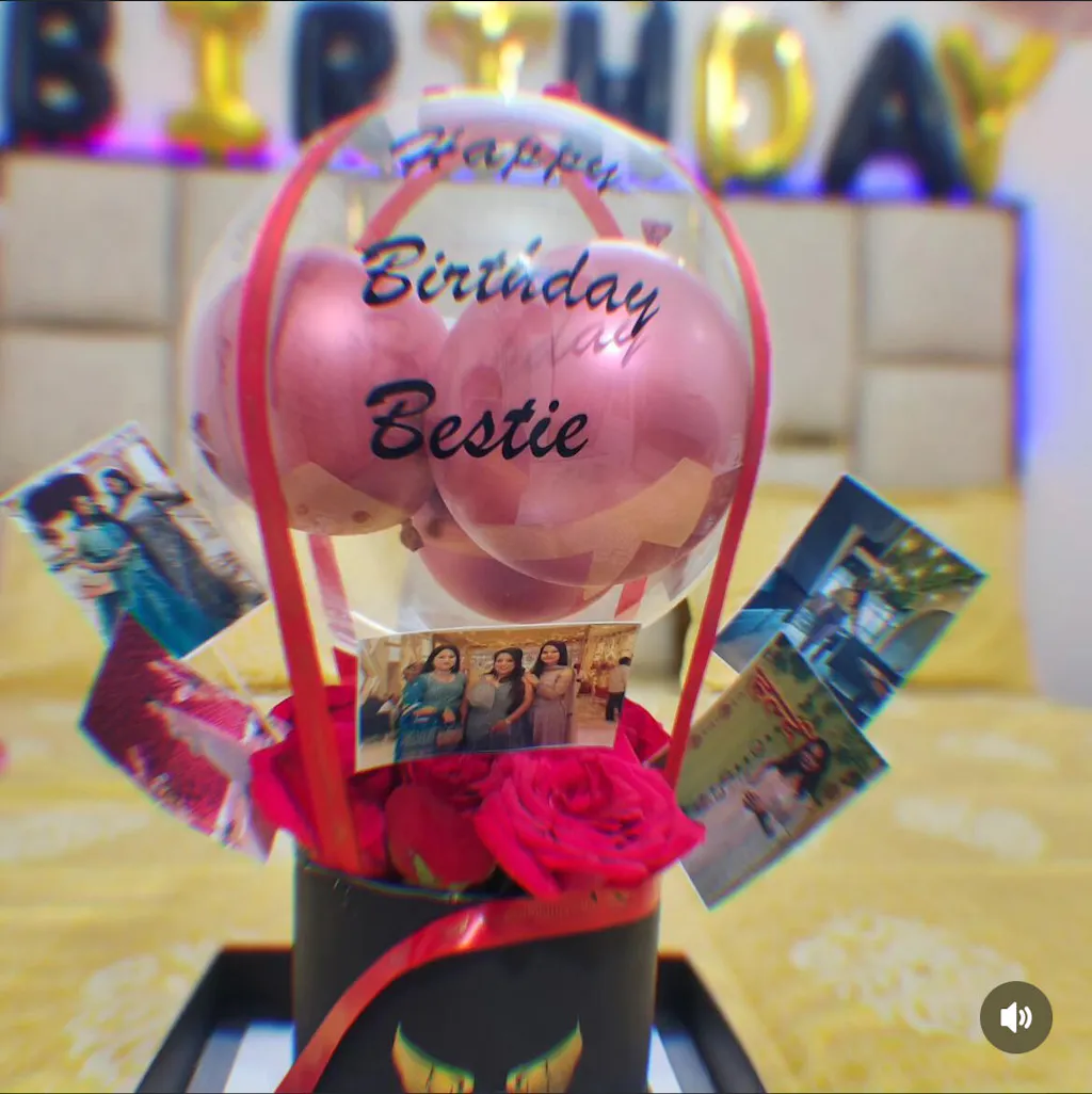 Celebrate in style with this personalized hot air balloon–themed balloon arrangement, featuring red chrome balloons, red rose, photos, a cake and soft LED lighting. Perfect as a gift or party décor, this elegant piece comes with a customizable message on balloon and a premium decorative base.