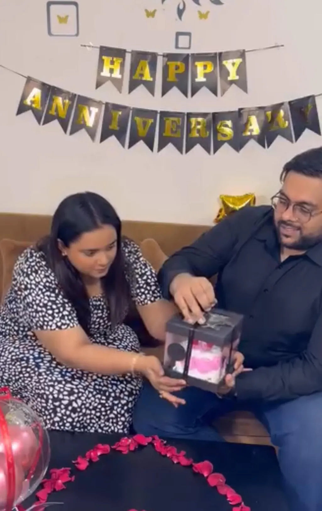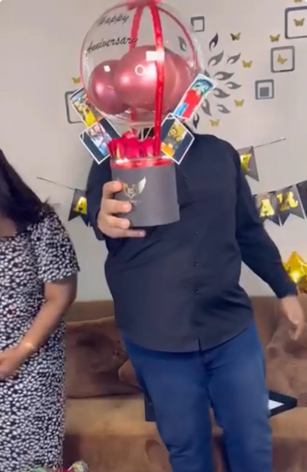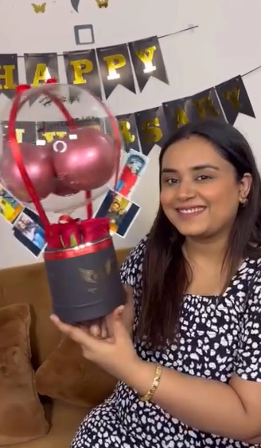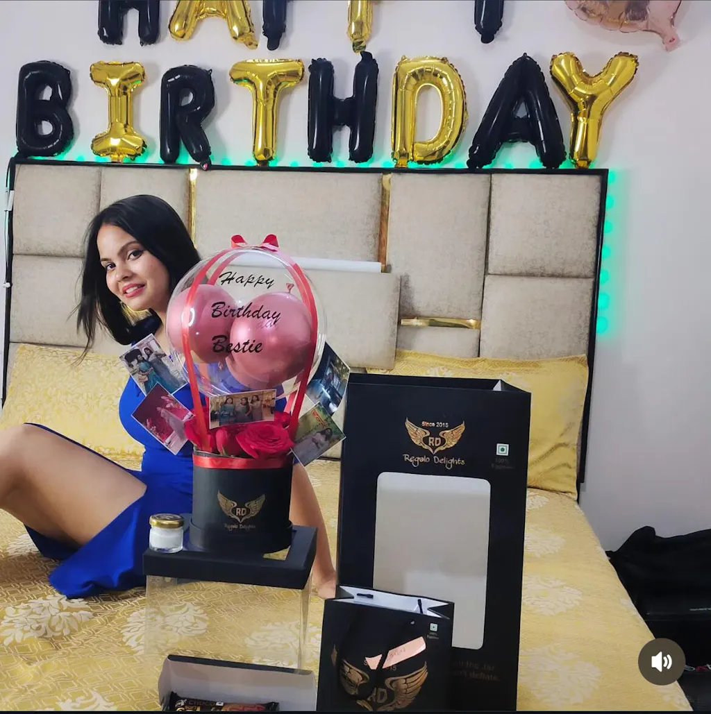 Celebrate in style with this personalized hot air balloon–themed balloon arrangement, featuring red chrome balloons, red rose, photos, a cake and soft LED lighting. Perfect as a gift or party décor, this elegant piece comes with a customizable message on balloon and a premium decorative base.