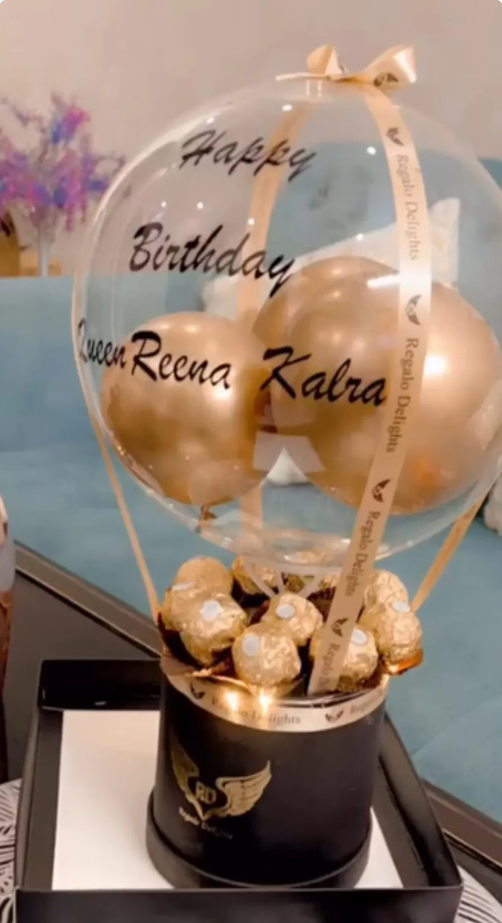 Celebrate in style with this personalized hot air balloon–themed balloon arrangement, featuring gold chrome balloons, ferrero rocher chocolates and soft LED lighting. Perfect as a gift or party décor, this elegant piece comes with a customizable message on balloon and a premium decorative base.